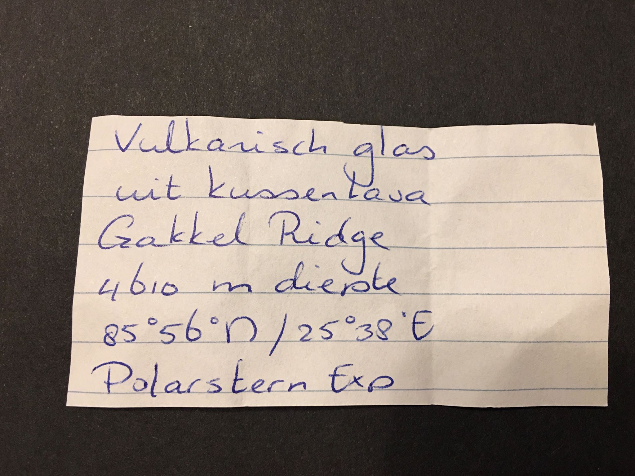 Dit stukje vulkanisch glas is op 4610 meter diepte gevonden tijdens de Polarstern expeditie in het gebied van de Gakkel ridge in de Noordelijke ijszee.