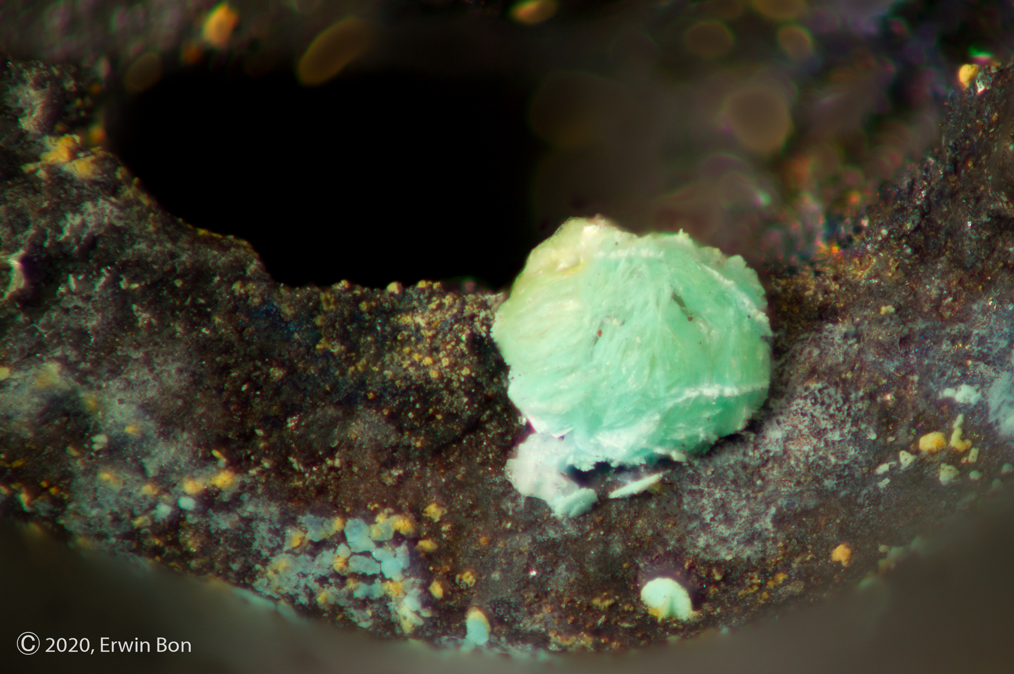 Slak van Sclaigneaux met kristallen van Gips en puntige Anglesiet. Er is ook nog een groenachtig derde mineraal dat nog niet gedetermineerd is. Er zijn diverse suggesties gedaan: Malachiet, Chalcophylliet, Devilline/Serpierite.