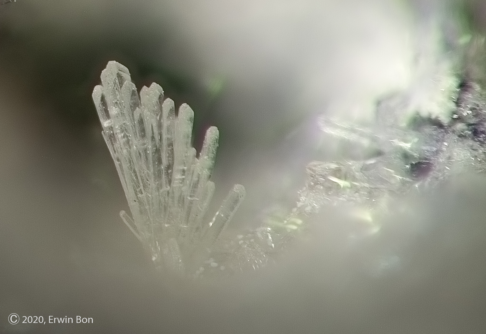 Ook op deze micro zat een groepje hele kleine topaaskristallen. Het groepje is nog kleiner dan het groepje op de vorige foto en zal ongeveer 0,35mm breed zijn.